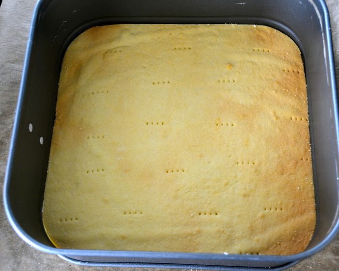 Духовку разогреть до 180 С. Через 30 минут достать корж из холодильника и поставить выпекаться на 15 минут. Дать остыть. И подровнять получившийся песочный корж по размеру рамки-формы (у меня 30Х30), в которой Вы будете затем выпекать сырник. Я подравнивала еще не окончательно остывший корж, он идеально вырезался. Отставить пока в сторону.