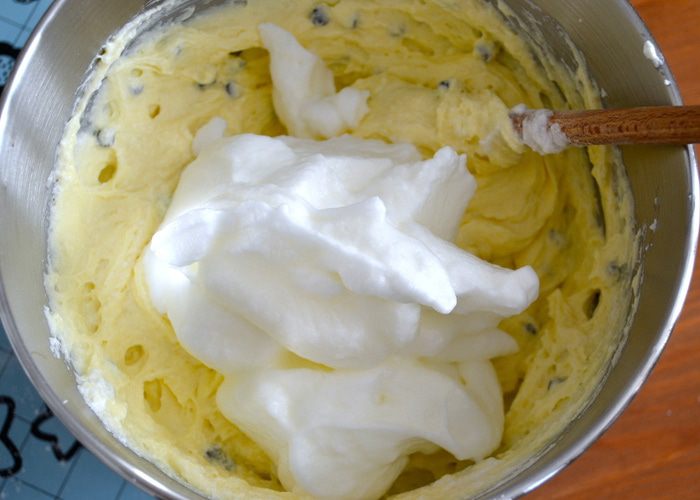 Затем постепенно, в три приема ввести взбитые яичные белки. Аккуратно перемешать, чтобы масса не осела.
