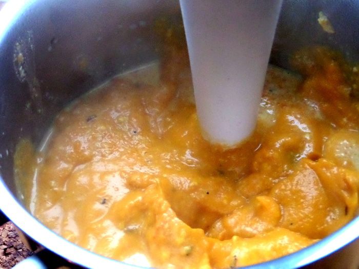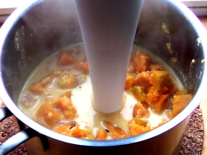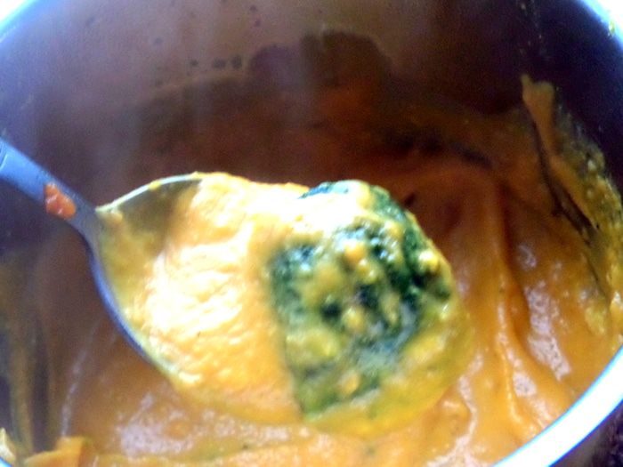 Тут мне захотелось добавить замороженный шпинат,пару кубиков по 25 грамм. Мешая в горячем,шпинат быстро растворяется в тыкве и не теряет своих витаминов.