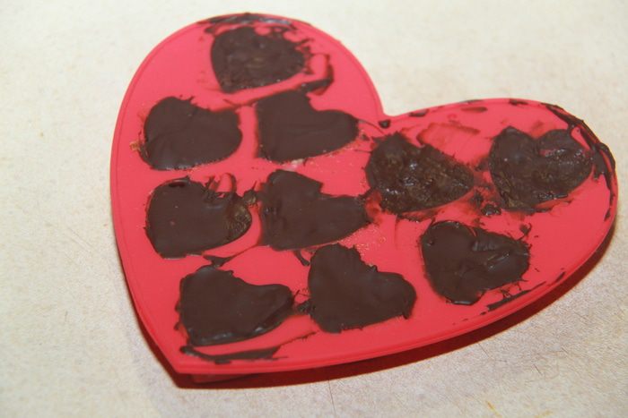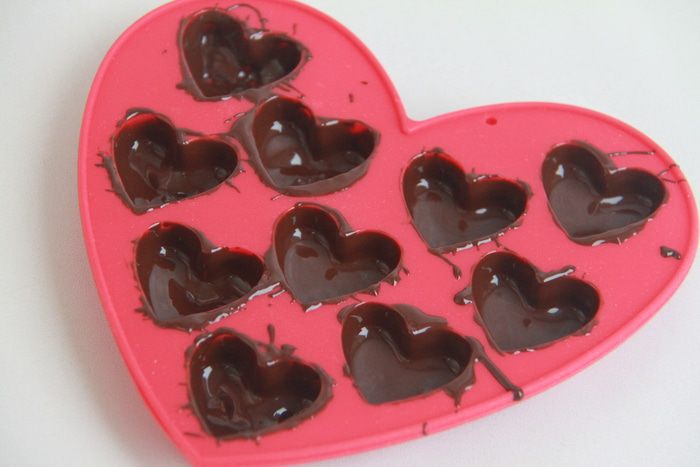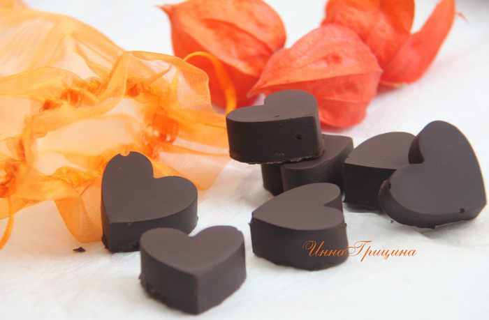 Для шоколадных конфет: смазать ячейки силиконовой формочки растопленным шоколадом (удобно растапливать в микроволновке, импульсами, периодически перемешивая), поместить формочку в морозилку минут на десять.