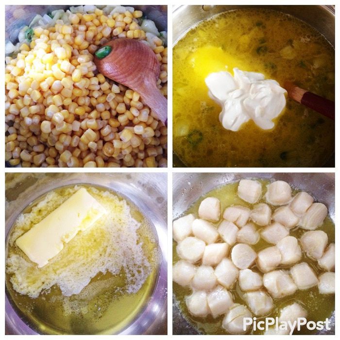 В другой кастрюле растапливаем сливочное масло, добавляем оливковое и обжариваем гребешки, периодически поливая их маслом. Гребешки жарятся быстро, вынимаем их на тарелку, а масло оставшееся выливаем в кастрюлю с луком.