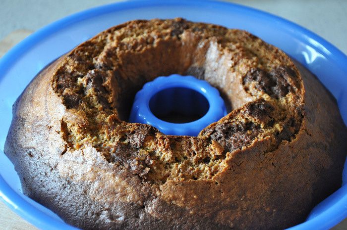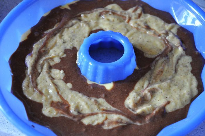 Отделить от теста треть и выложить в форму. Остальное тесто разделить на 2 части. В одну вмешать орехи, во вторую - какао. Выложить обе массы в форму, перемешать аккуратно вилкой, чтоб получился мраморный рисунок.