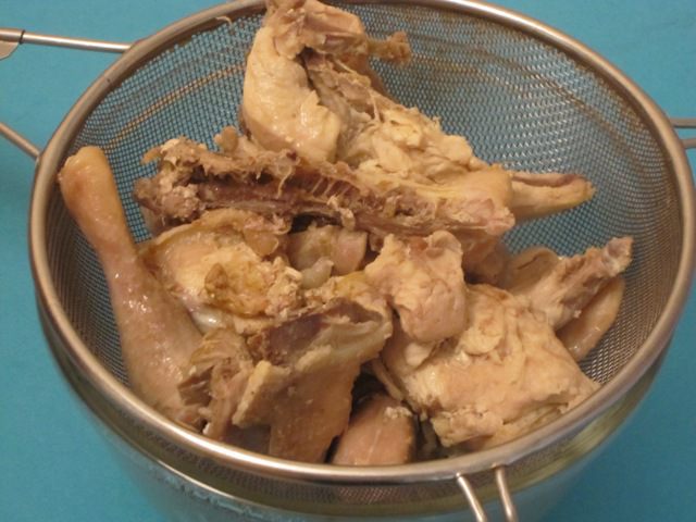 Кусочки курицы готовятся без добавления воды. Когда я открыла мультиварку, то сока от курицы почти не было видно, его было мало. Процедила через марлю, положила мелко нарезанное мясо. Было бешеное желание добавить воду, но я сдержала себя, и правильно сделала.