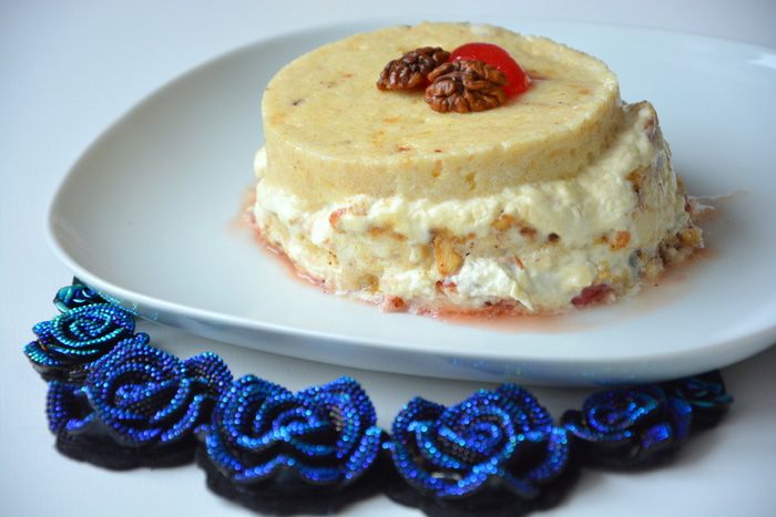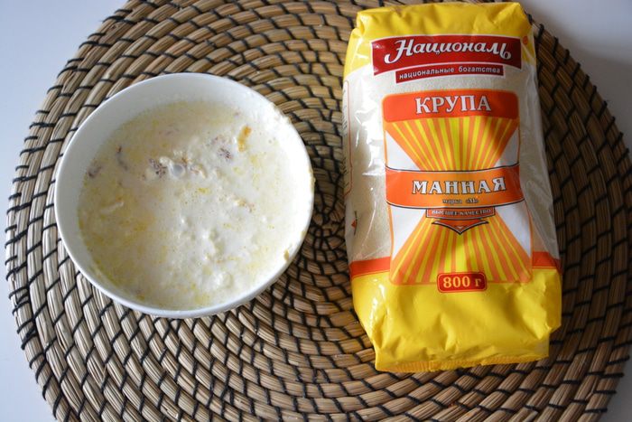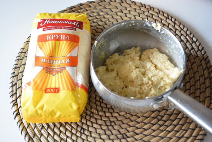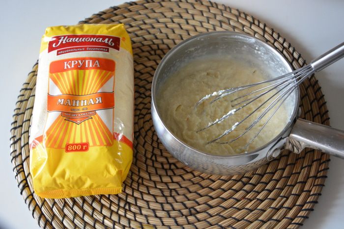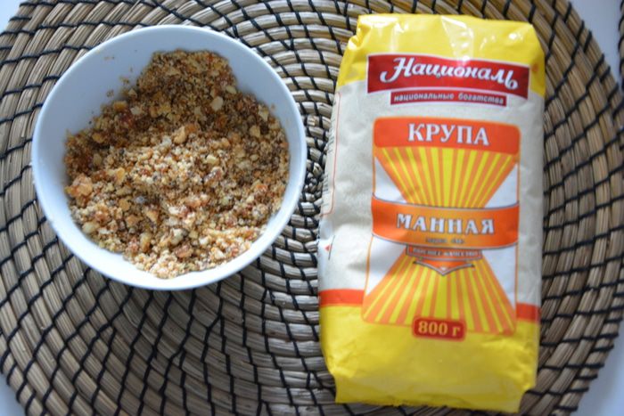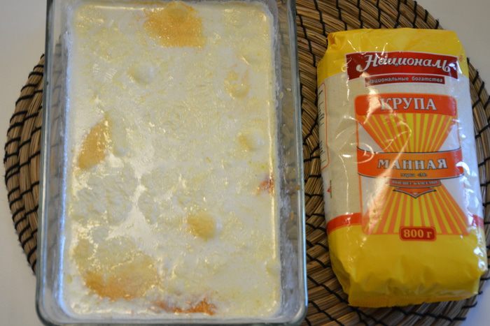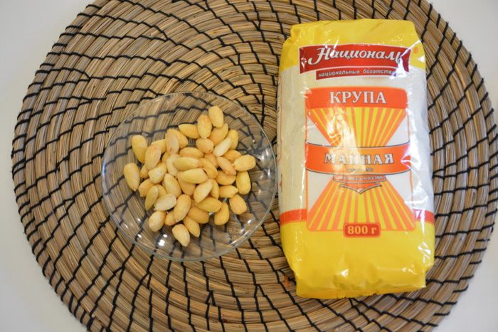В жаропрочную форму выложить манную кашу слоем 0,5 — 1 см, закрыть его пенкой, насыпать орехов, вновь выложить слой каши и снова переслоить пенкой и орехами и т.д.