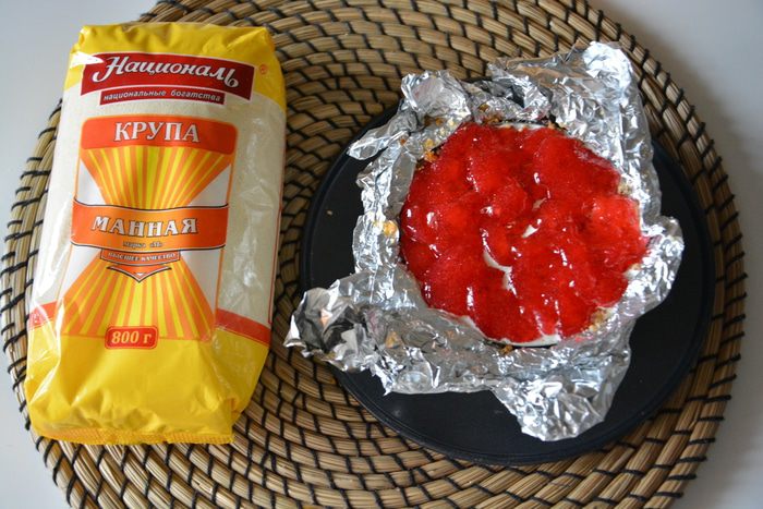 Я взяла жаропрочный круг для формирования салатов, десертов. Обмотала его фольгой, смазанной сливочным маслом, и в эту форму выкладывала кашу. В предпоследний слой добавить немного варенья. Я добавила домашнее желе из красной смородины. Поставить на 10 минут в предварительно разогретую духовку, но со слабым огнем (примерно 150°С).