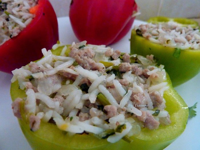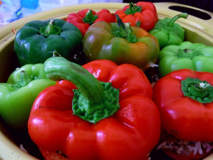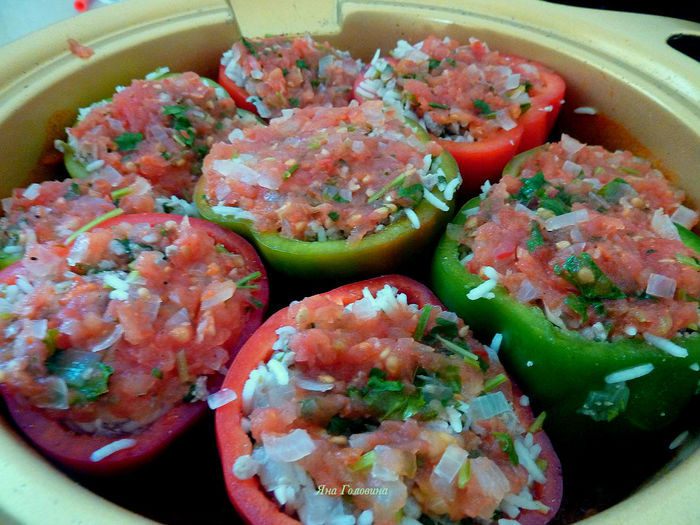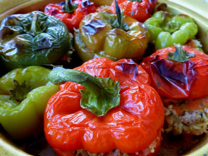 Рецептов фаршированных перцев очень много, но я решила поделиться немного отличающимся вариантом. Перцы получаются очень вкусные и ароматные. На фарш беру красное мясо индейки, можно заменить на любое мясо. Важно заранее подобрать кастрюлю, в которую поместятся перцы, и чтобы подходила для духовки и гриля.