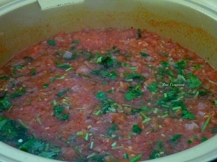 Соус: 2 луковицы мелко порубить, помидоры взбить в комбайне и процедить. В глубоком сотейнике обжарить лук на масле, добавить помидоры, стакан воды и специи. Довести до кипения и добавить отложенную кинзу.