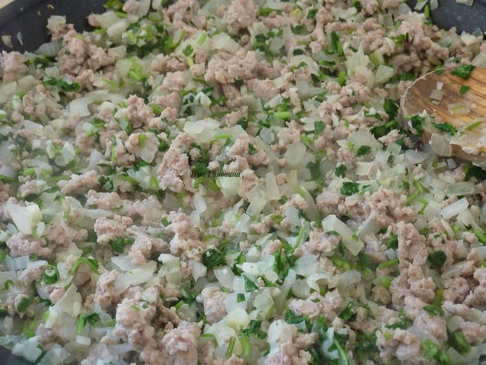 Начинка: 4 зубчика чеснока мелко порубить и 4 зубчика выдавить через пресс, 1 лук и кинзу очень мелко порубить, отложить около 2 ст. л. кинзы в сторону для соуса, обжарить на сковородки лук, чеснок, мясной фарш и кинзу.