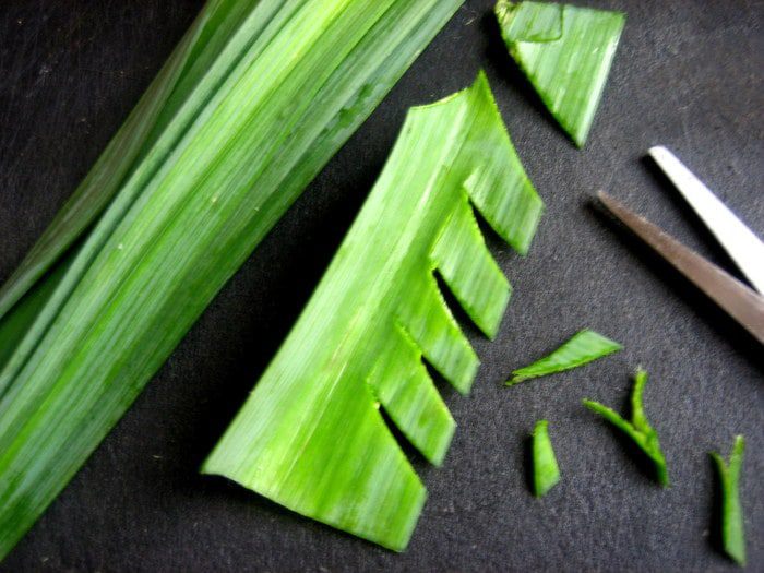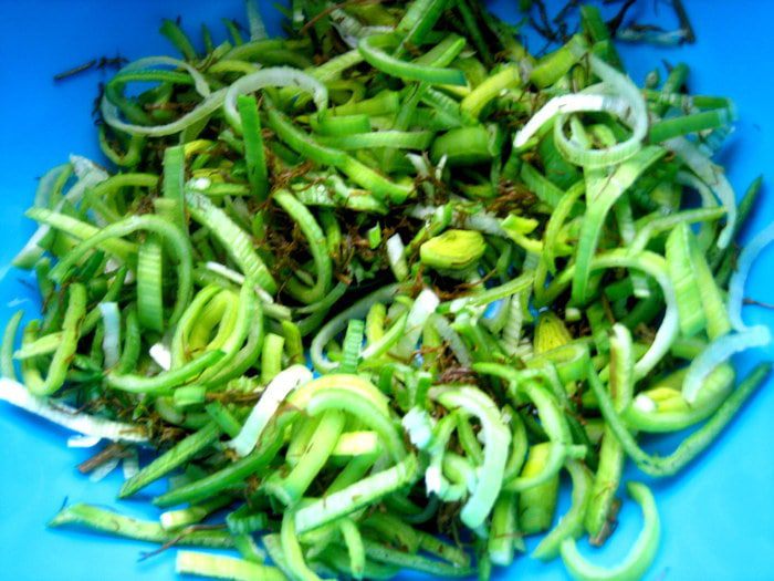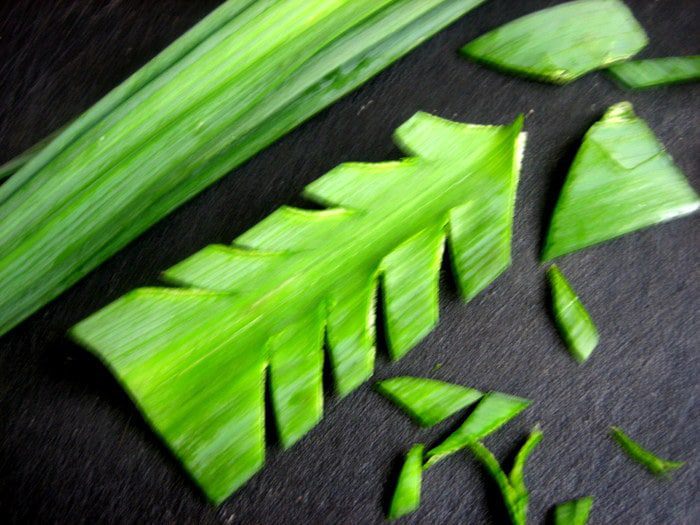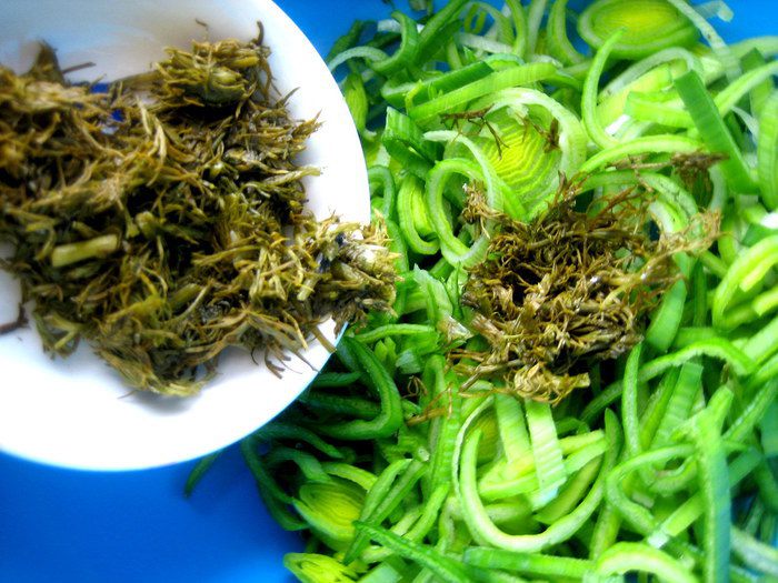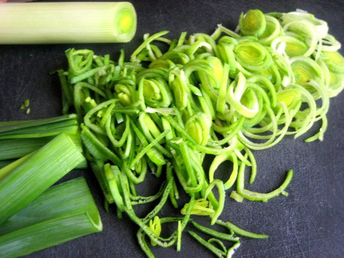 Я использовала среднюю часть лука порея,треть стебля нарезать тонкими кольцами.