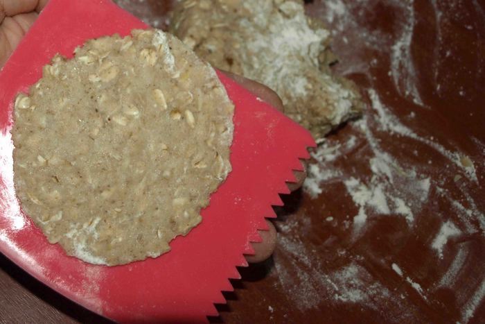 Расплющиваем скребком для теста или рукой на припыленной мукой поверхности.
