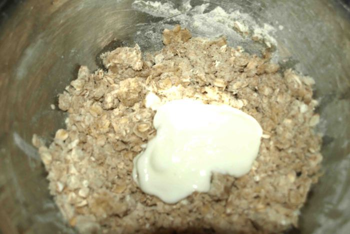 Добавить йогурт и соединить тесто в ком. При необходимости добавить муку. Тесто немного липнет к рукам.