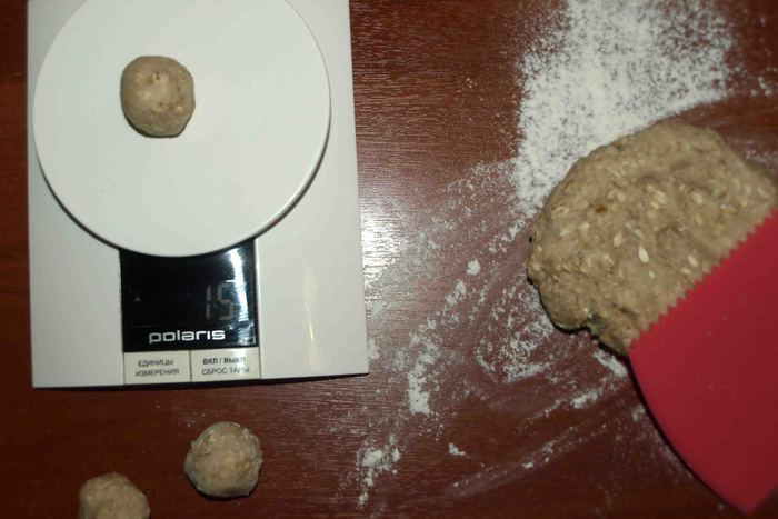 Руки припудрить мукой. Отделяем от теста кусочки величиной с грецкий орех (у меня шарик весом 15 г).