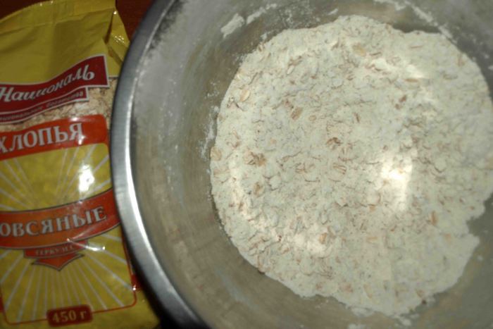 Муку просеять и соединить с овсяными хлопьями Геркулес ТМ «Националь». Добавить соль, разрыхлитель или соду, измельченные каштаны (50 г), сахарную пудру. Перемешать.