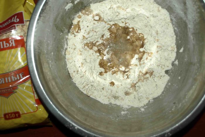 В центре сделать углубление и добавить растительное (оливковое) масло, воду и смешать все.