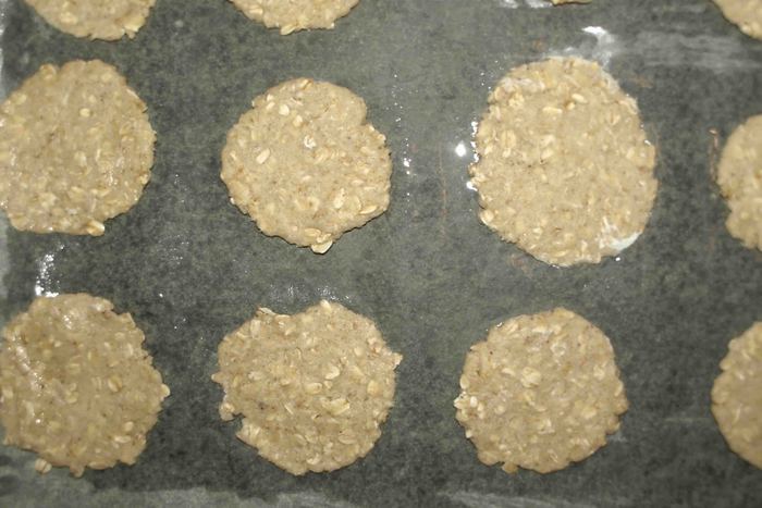 Выкладываем на противень, застеленный пекарской бумагой (бумагу смазать растительным маслом), и отправляем на 10 минут в заранее разогретую до 180°С духовку.