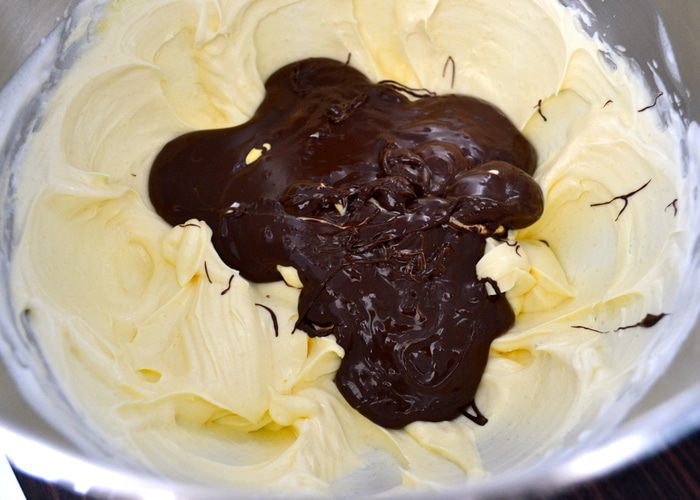 Затем добавить в крем взбитые желтки и расплавленный шоколад. Осторожно перемешать, чтобы масса не осела.