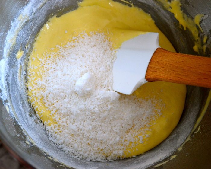 Яйца взбить с сахаром до полного растворения сахара. Сухие ингредиенты (муку, крахмал, разрыхлитель) просеять. Осторожно смешать сухую смесь со взбитыми яйцами. В конце добавить коксовую стружку и все перемешать.