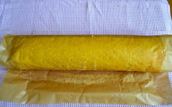 Готовый бисквит достать из духовки и свернуть в рулет вместе с бумагой. Минут через 15-20 аккуратно развернуть рулет, освободить от бумаги и снова закрутить на время пока будет готовиться крем.