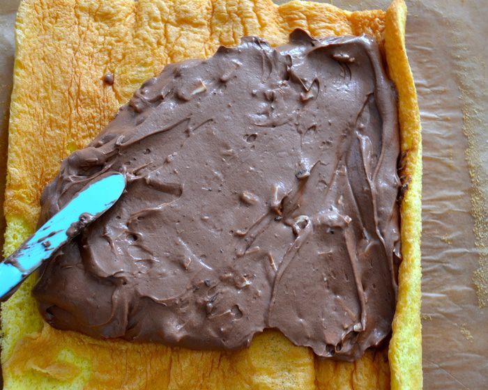 Бисквит осторожно развернуть и смазать кремом.