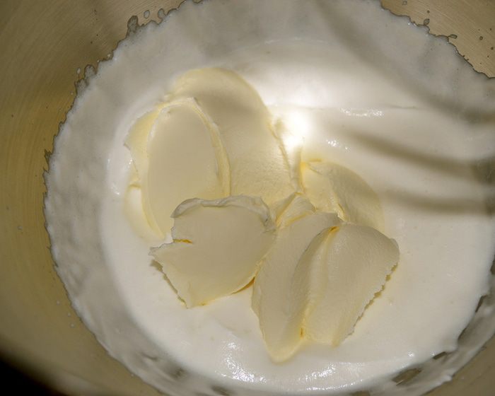Отдельно взбить сливки, затем добавить маскарпоне комнатной температуры и продолжить взбивать.