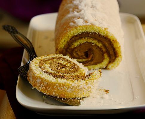 Завернуть рулет. Я обернула пищевой пленкой и убрала на некоторое время в холодильник для пропитки.