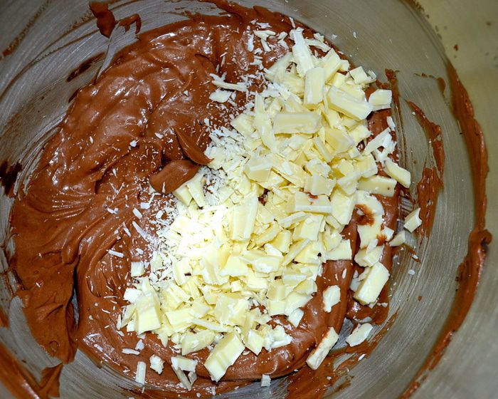 Белый шоколад нарезать не очень мелкими кусочками и добавить в крем. Перемешать.