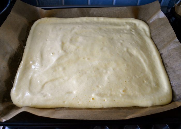 На застеленный пекарской бумагой противень выложить тесто и разровнять. Выпекать в разогретой до 200 С духовке 12-15 минут.