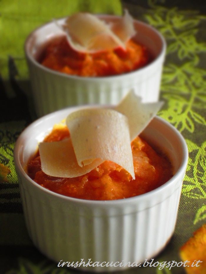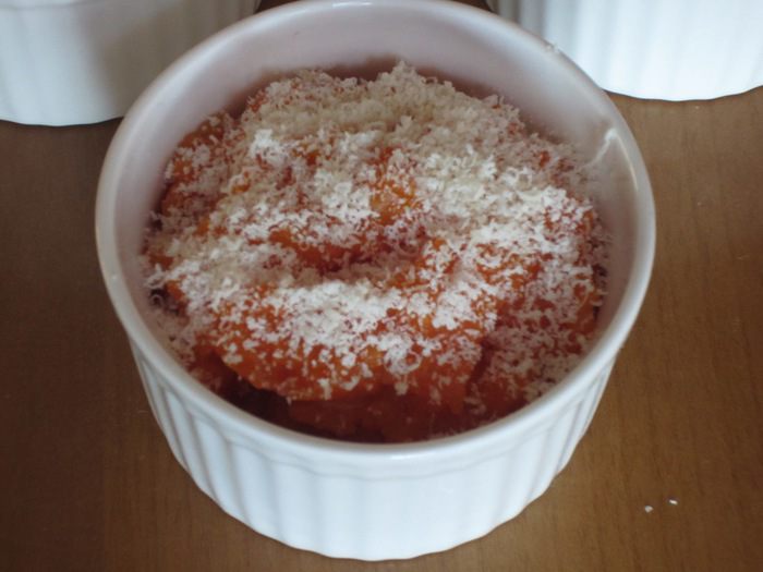 Пропустить овощи через овощной пресс, выложить в креманки, посыпать тёртым пармезаном и запекать в разогретой до 180 °С духовке 10 минут.