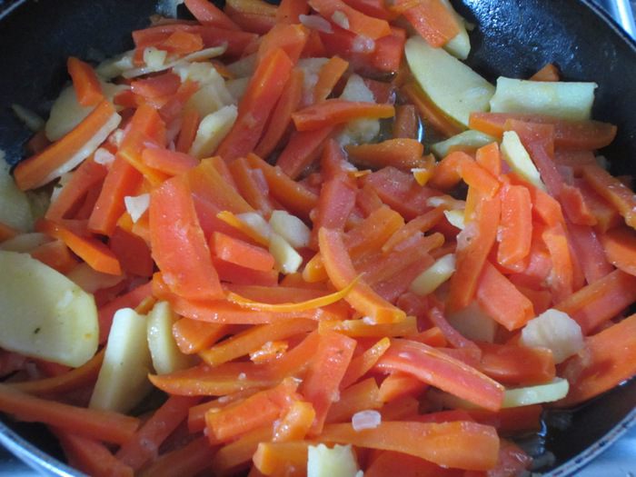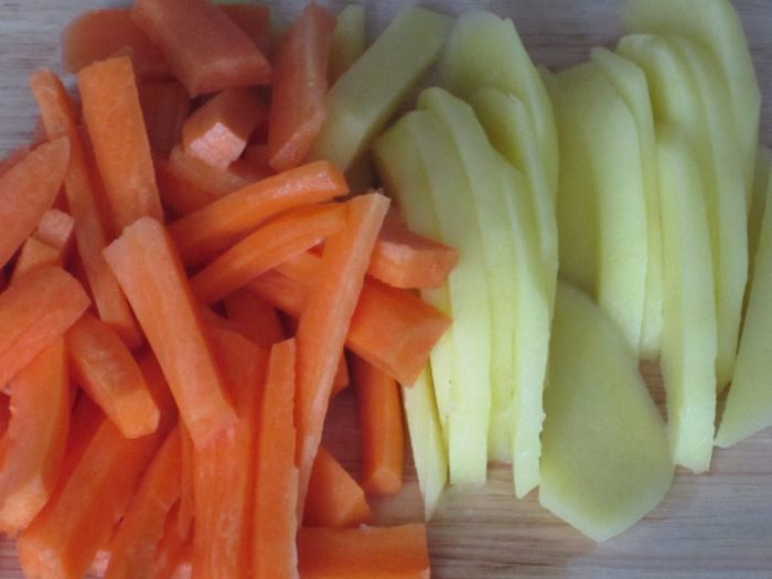 Картофель и морковь нарезать тонкими пластинками.