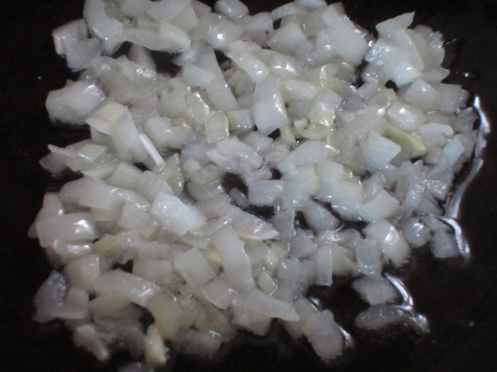 Лук мелко нарезать и обжарить на оливковом масле до прозрачности на слабом огне 5 минут. Добавить 1 половник овощного бульона и готовить ещё 10 минут.