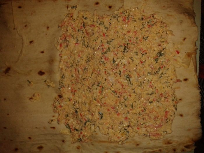 2-я начинка. Крабовые палочки, яйца, лук, красный перец - через крупную терку, добавить мелко нарезанную зелень, майонез и размазать начинку на лаваше.