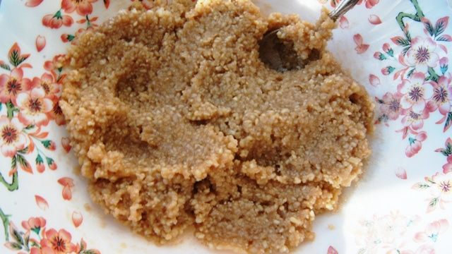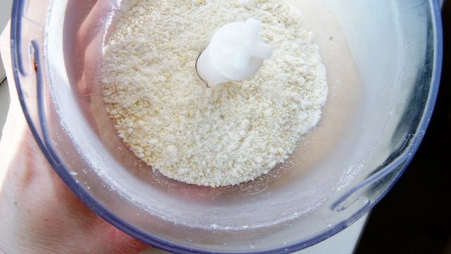 Смолоть орехи в блендере в муку, добавить пудру и смолоть еще раз. Вот такая мука с крупинками орешков нам нужна.