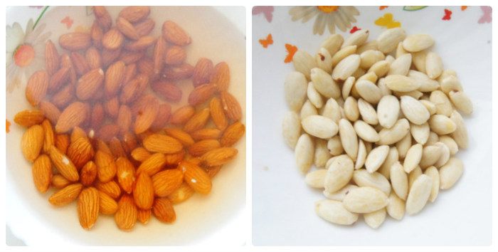 Миндаль залить кипятком на 5 минут, затем очистить от кожицы. Подсушить в духовке при 100°С около 10 — 15 минут. Орешки не должны поджариться, только подсохнуть. Остудить.