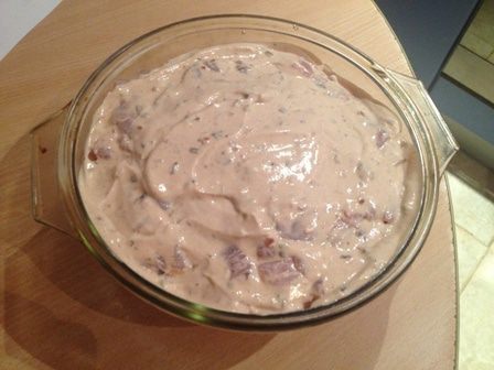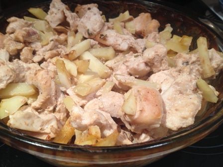 Картошку нарезать соломкой, куриные грудки мелко нарезать. Смешаем сметану и кетчуп 50/50. Духовку нагреть до 180 градусов. Выкладываем картошку, сверху нарезанные куриные грудки и всё это заливаем сметаной с кетчупом.