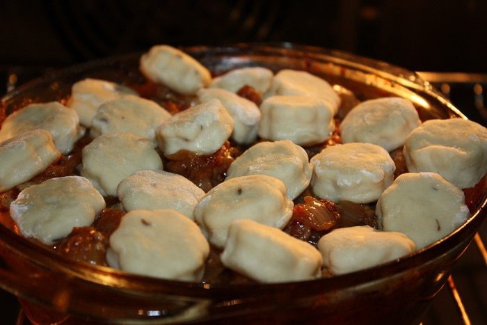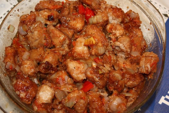 Лук нарезать на кубики крупно и обжаривать на растительном масле. Когда лук станет прозрачным, добавить нарезанный чеснок и довести до готовности. Добавить к мясу и перемешать. Затем добавить сливовый соус (его можно заменить соусом «Ткемали»), специи, бульон и вино. Все хорошо перемешать, накрыть крышкой и поставить в разогретую духовку до 180 градусов. Время в духовке – 1 час 30 минут.