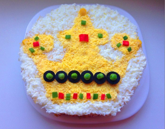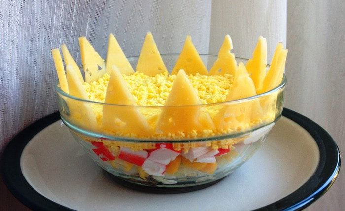 Еще оригинальнее этот салат будет смотреться в случае порционной подачи. Для этого все слои в такой же последовательности выложить по индивидуальным бокалам. Сыр нарезать треугольничками и разместить их в виде короны вдоль стенок бокала.