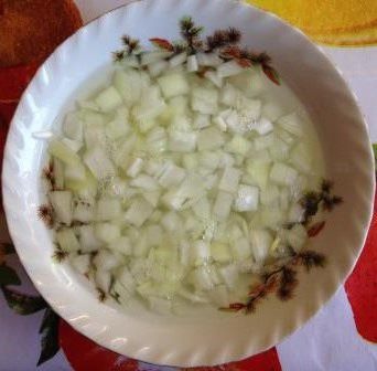 Лук залить кипятком (можно добавить уксус), затем отжать.