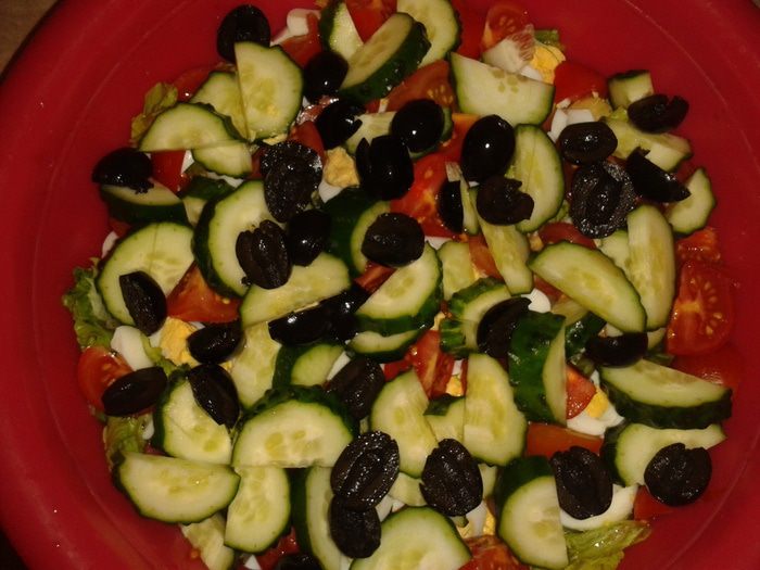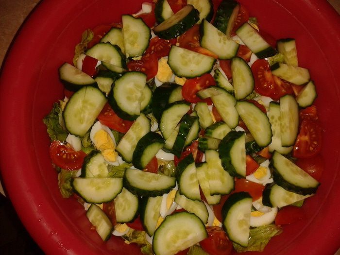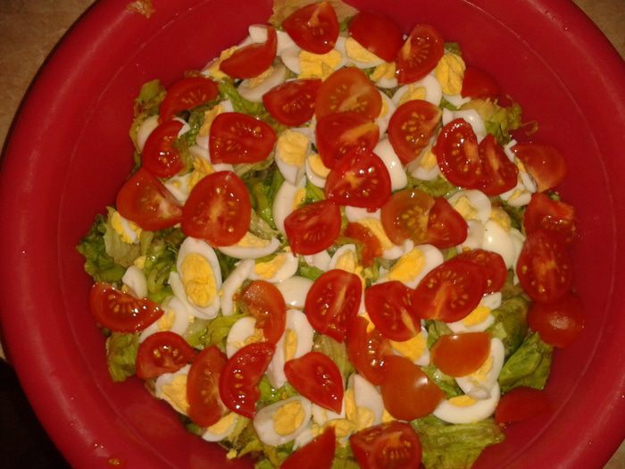 Вымыть помидоры черри, нарезать крупно, яйца перепелиные отварить и нарезать крупно.