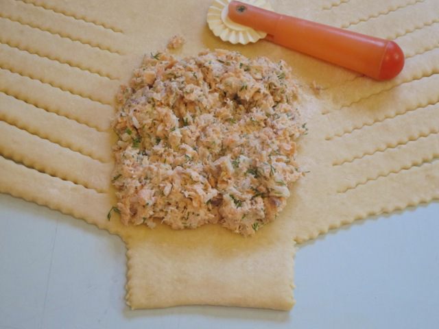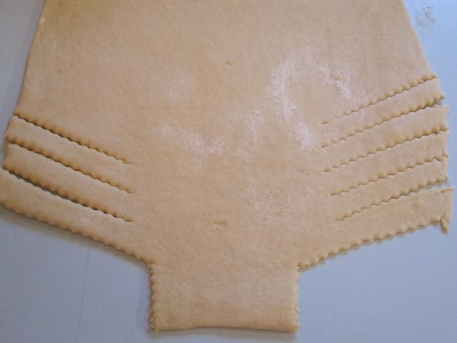 В это время тесто уже поднялось, можно заняться им. Тесто раскатать в прямоугольный пласт размером приблизительно 35х38 см. Края с двух сторон разрезать на полоски шириной 2 см.
