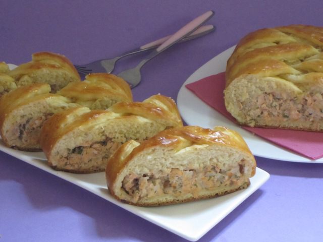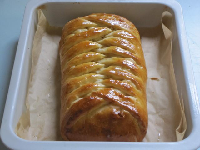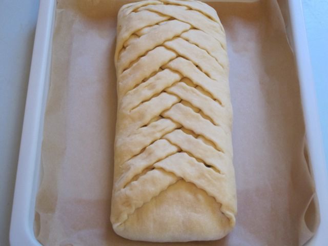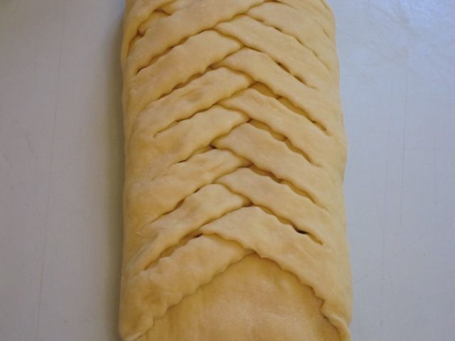 Заплести косу из теста, накладывая полоски поверх начинки одна на другую. Коса должна быть достаточно плотной.