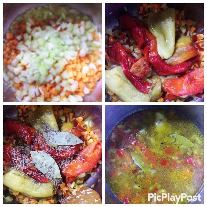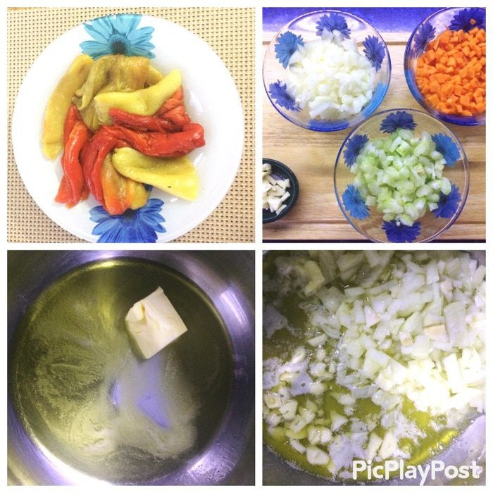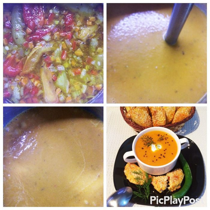 Осенью я запекала перец, потом его замораживала. Поэтому, для того, чтобы приготовить этот суп, я просто вынула порцию замороженных печеных перцев, разморозила их и приступила к готовке супа. У кого такой заготовки нет, тогда придется перцы выпекать, чистить, а потом использовать по назначению.