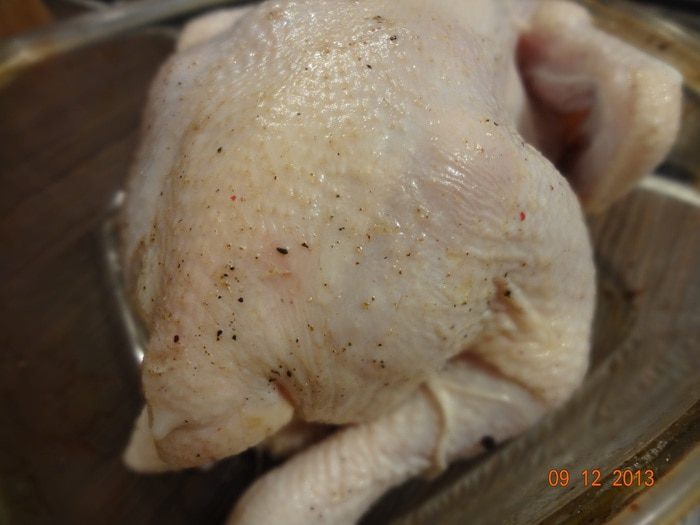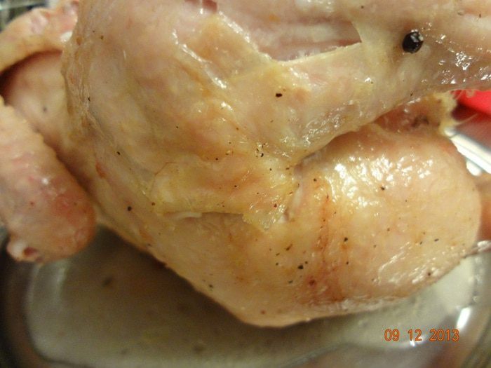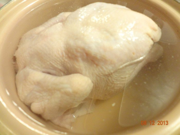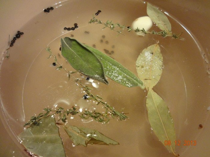 Отмерив количество воды, которое получилось, приготовить рассол, исходя из следующего: на 1 литр воды необходимо - 20 гр. соли, 2 лавровых листа, 1 целый зубчик чеснока, 2 веточки тимьяна, 1 лимон, порезанный на кружочки (не использовала), 2 листика шалфея, черный перец горошком. Довести все до кипения, полностью остудить. Поместить в остывший рассол курицу, накрыть крышкой, убрать в холодильник на 8-10 часов.