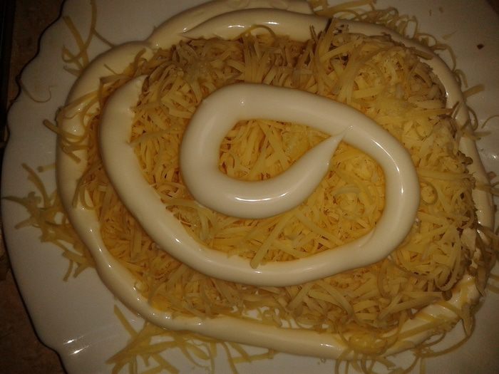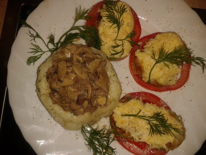 На помидор выложить кабачок, сверху майонез с сыром, из картофельного пюре сделайте горочку, сверху надавите ложкой и сформируйте небольшую ямку, в которую и добавьте грибы.