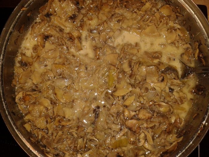 Грибы помыть, нарезать лук и грибы, пожарить на подсолнечном масле, посолить, в конце добавить сливки.