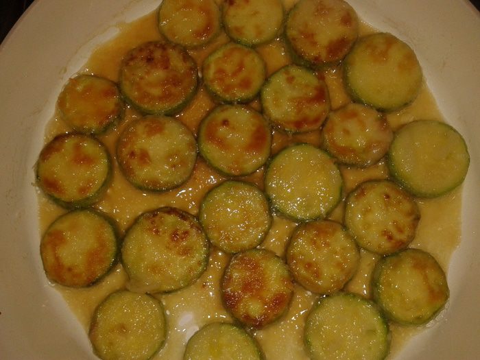 Кабачки помыть, нарезать кружочками, посолить и оставить на 15 минут , затем обсыпать мукой и обжарить с обеих сторон.