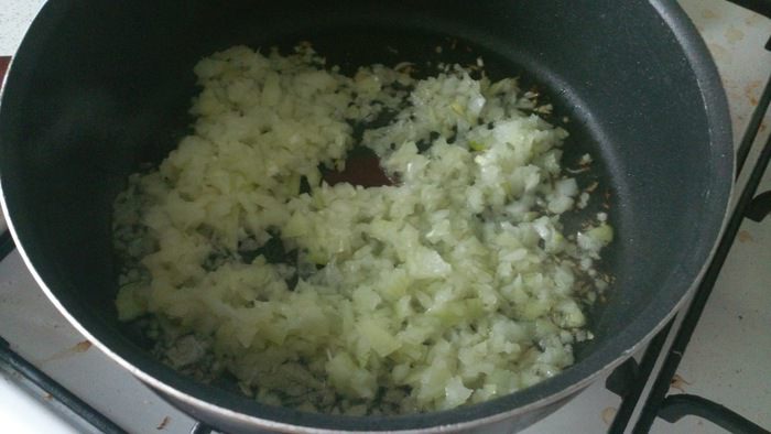 Разогреть в сковороде по 2 ст. л. сливочного и растительного масла. Слегка обжарить на нем одну мелко нарезанную луковицу.