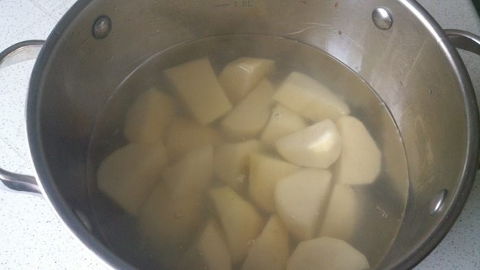 Горячий картофель размять и добавить капусту. Приправить солью и перцем, перемешать и остудить.