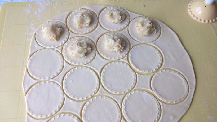 Раскатать тесто в тонкий пласт, вырезать формой кружочки и разложить начинку.