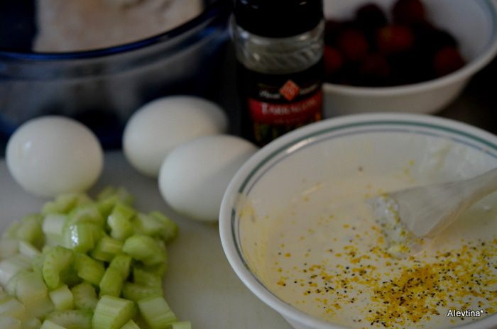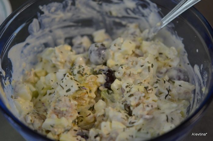 Для заправки: смешать сметану с майонезом, лимонным соком, солью и специей.