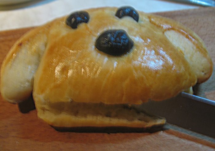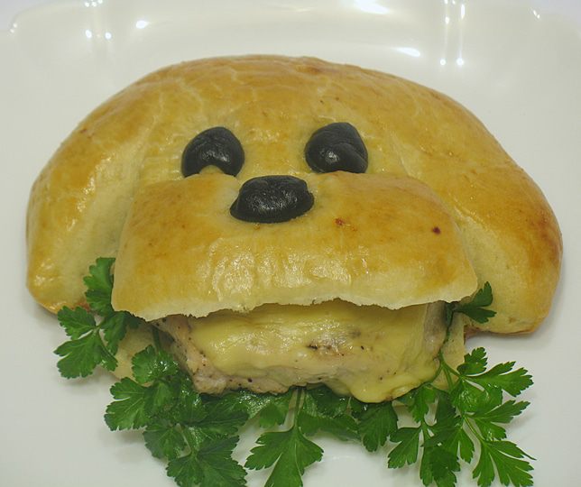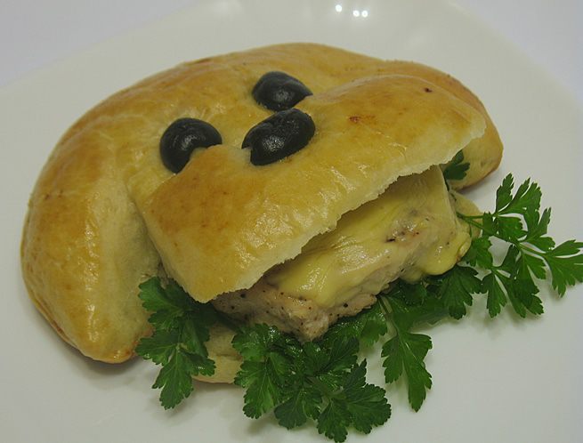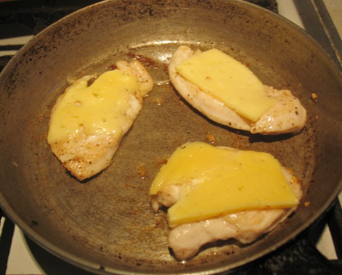 Пока булочки выпекаются займемся курочкой. Нарежем филе на кусочки. Посолим, поперчим по вкусу. Дадим немного промариноваться. Порежем сыр на кусочки. Обжарим курочку с двух сторон. На одну сторону кладем сыр и закрываем сковороду крышкой, чтобы сыр расплавился. Переложить на тарелку и дать отдохнуть.